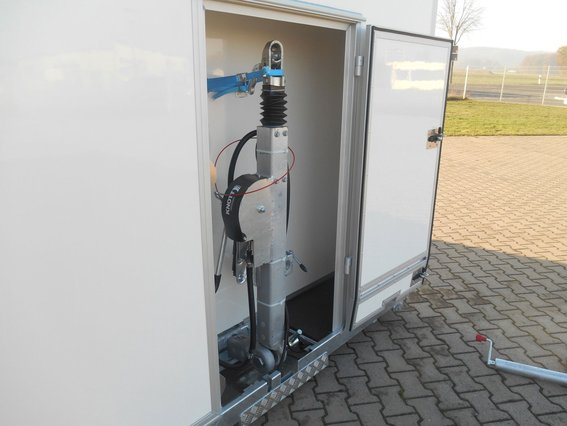 Stabil und verwindungssteif, und in den Säulen befinden sich die Kurbelstützen bei diesem Sonderanhänger